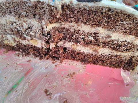 - Coloque a primeira parte de bolo num prato e por cima coloque com uma colher 50 ml de 7 up, cubra com uma camada do creme, parta 3 palitos de kinder bueno por cima do creme, coloque outra camada de bolo e proceda da mesma forma.