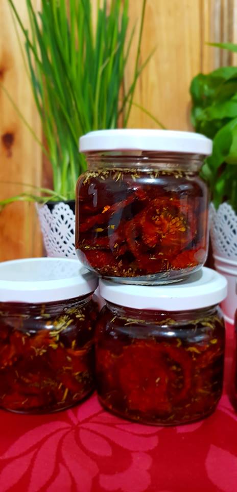 - Depois é só esterilizar os frascos bem esterilizados, colocar o tomate seco, as ervas, encher de azeite, têm de encher até cima, para manter a conservação