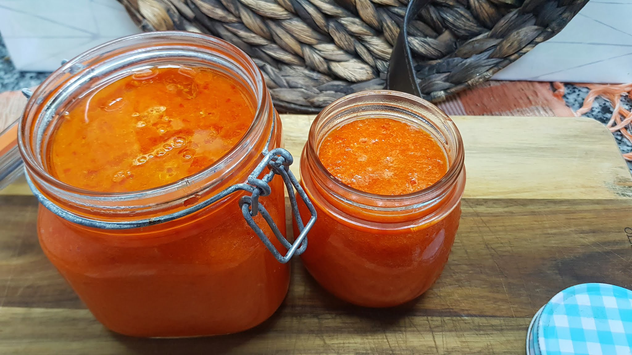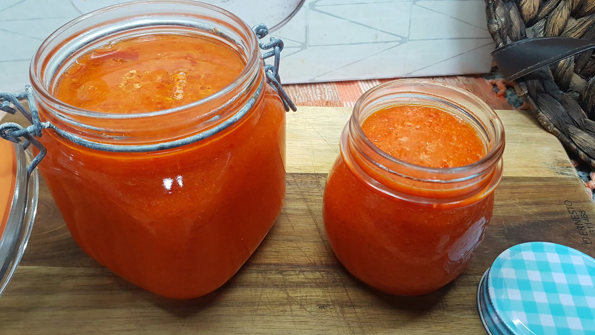 - Colocar este preparado num frasco esterilizado, deixar arrefecer, colocar um fio de azeite por cima, até cobrir a superfície.
