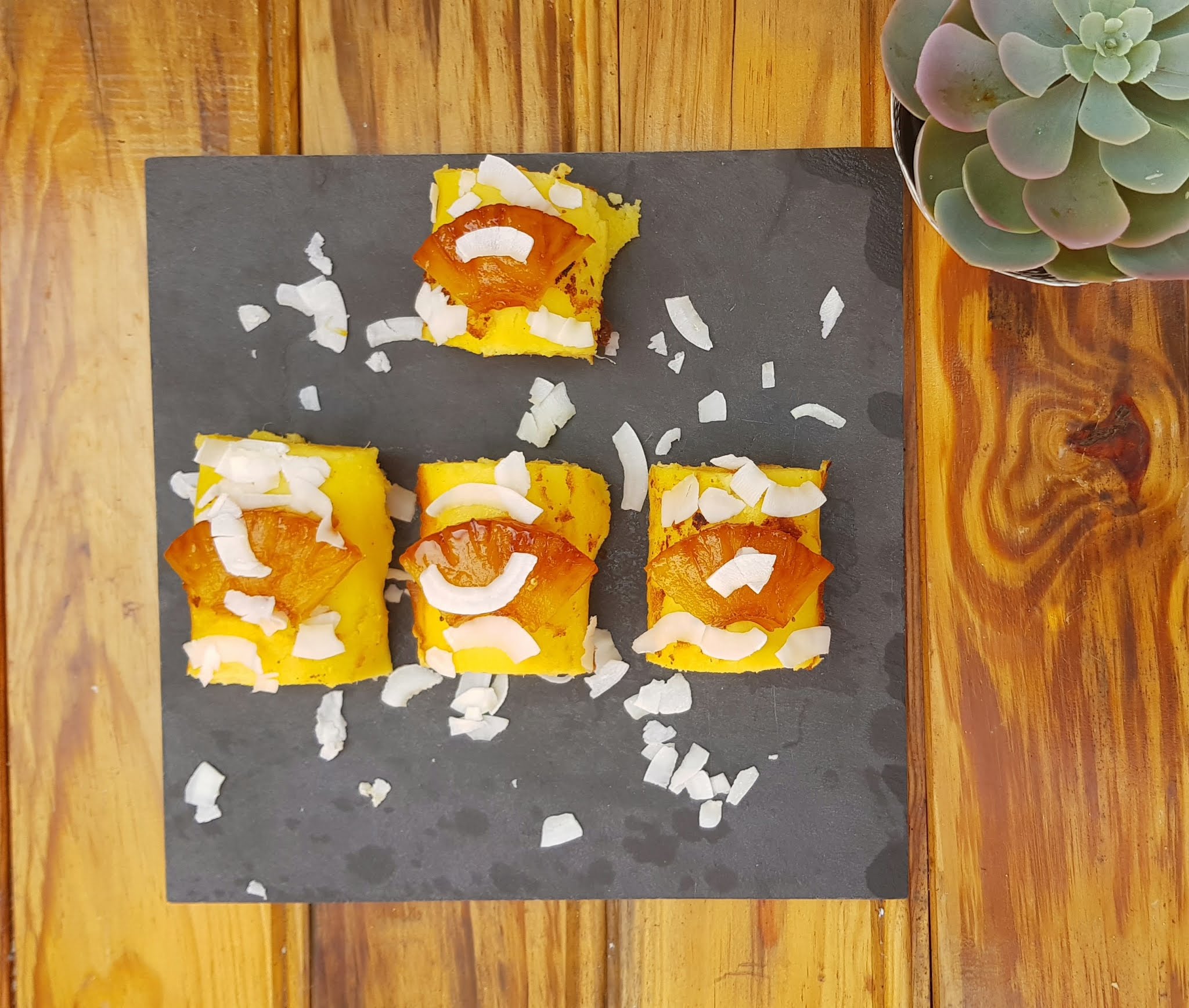 - Corte as rodelas em pedaços e use para decorar as tortas, e polvilhe com lascas de coco desidratado ou coco ralado.